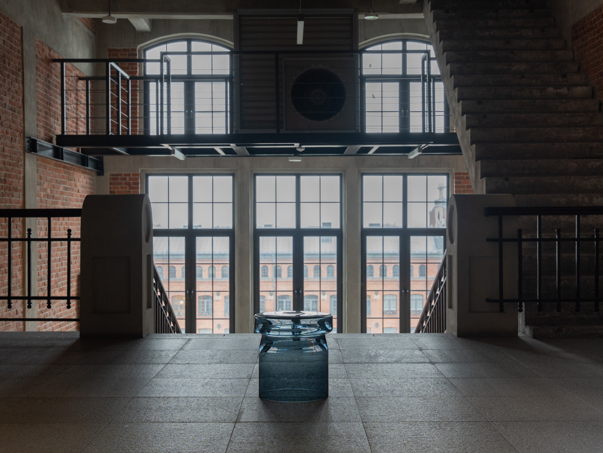 Ważącą ponad 20 kg porcję szkła umieszcza we wcześniej przygotowanej formie i na tym etapie obracając i jednocześnie wdmuchując powietrze, formuje kształt stolika.
