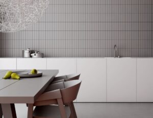 Samo mieszkanie ma niespełna 60 mkw. Głównym pomieszczeniem jest tu otwarta strefa dzienna, która łączy przestrzeń kuchenną z jadalnianą i salonową. I choć nie ma tu jasno wyznaczonych granic, poszczególne strefy są wyraźnie wyodrębnione za pomocą kolorystyki. Minimalistyczna kuchnia w postaci aneksu ubrana została w biel i szarości. Poprowadzona na jednej ściana biała zabudowa meblowa utrzymana w macie wyznacza tę przestrzeń funkcjonalną. Pozbawiona szafek górnych, całkowicie zbędnych dla osoby prowadzącej aktywny tryb życia poza domem, zapewnia wystarczająco dużo miejsca do wykonywania podstawowych prac kuchennych. Tuż nad blatem roboczym wyeksponowane zostały szare kafle, ułożone w pionie, by optycznie powiększyć przestrzeń. Dzięki temu aneks kuchenny doskonale wtapia się tło.