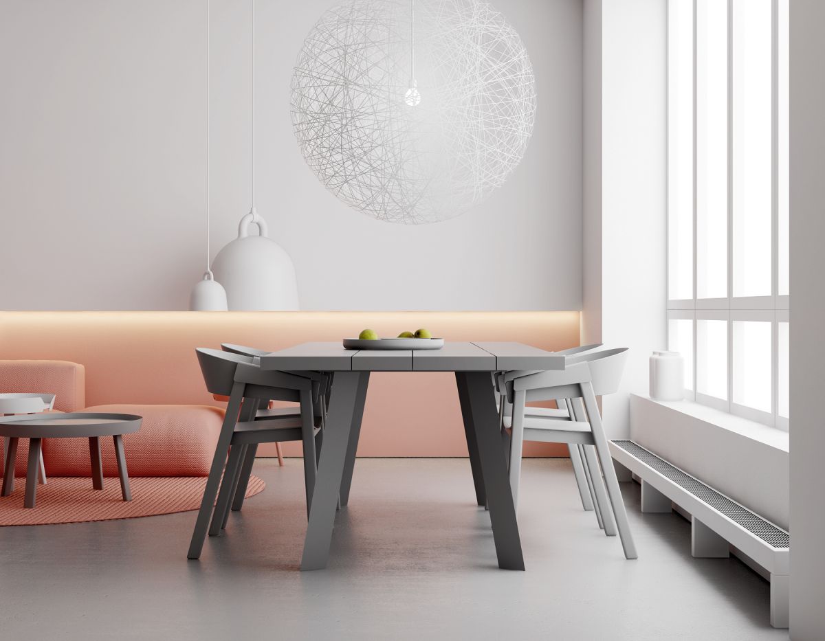 Między kuchnią a salonem umiejscowiona została jadalnia. Organizuje ją duży stół w szarym kolorze, nad którym niezwykle efektownie prezentuje się wisząca okrągła lampa wizualnie przypominająca dmuchawiec. Podkreśla ona kobiecy charakter wnętrza, wprowadzając do surowej, minimalistycznej przestrzeni obłe formy, które w pełni odnajdziemy w części wypoczynkowej. Tu poza krągłymi liniami do głosu dochodzi pastelowy róż. W tym kolorze jest wygodny zestaw wypoczynkowy, dywan oraz fragment ściany na wysokości kanapy. Całość uzupełniają trzy stoliki kawowe, utrzymane w kolorystyce całego mieszkania – biały, szary i różowy.