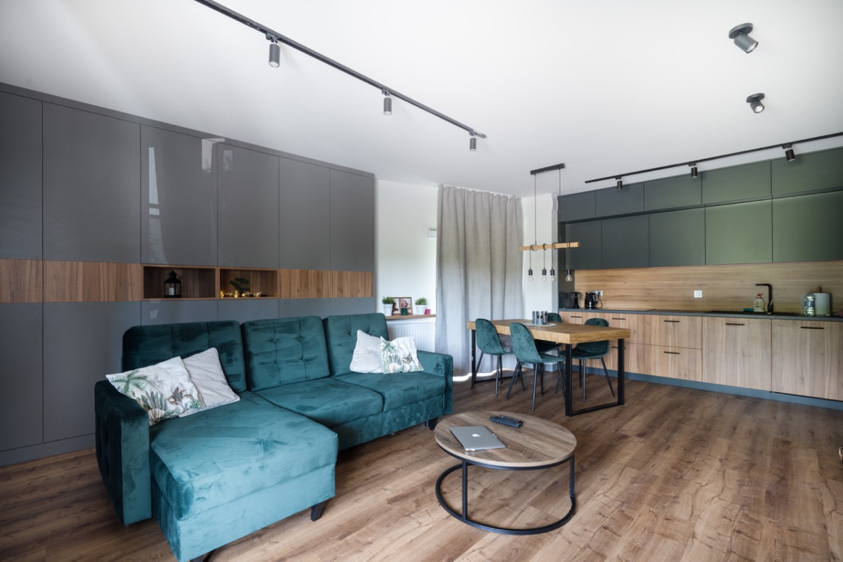 Rysunek drewna efektownie eksponują kolory wybrane z palety barw ziemi, które dodatkowo wpisują aranżację w aktualne trendy wzornicze. Wśród nich szczególną uwagę przykuwa butelkowa zieleń. W tym odcieniu są wszystkie meble tapicerowane wykończone miękkim aksamitem. To one wnoszą nutę elegancji i odrobinę sentymentu do tego nowoczesnego wnętrza.