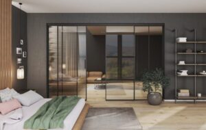 Trudno przy tym wszystkim znaleźć sposób na urządzenie komfortowej sypialni, która dodatkowo będzie dobrze się prezentować. Nie znaczy to jednak, że się nie da. Z pomocą przyjdą efektowne przeszklenia z systemu Lumi z oferty marki Komandor. Dzięki stałym panelom bocznym i przesuwnym drzwiom można oddzielić salon od sypialni. Aby nadać wyjątkowego charakteru oddzielanym wnętrzom warto zastosować jako wypełnienie szkło ryflowane. Jego wyjątkowy wzór i subtelna przezierność pozwolą zachować intymny charakter sypialni, zapewniając jednoczesny prześwit światła pomiędzy pomieszczeniami.