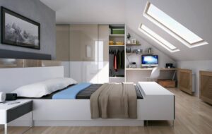 Do problematycznych w urządzeniu wnętrz należy także poddasze. Przestrzeń pod skosami jest trudna do zagospodarowania i wymaga specjalnych rozwiązań. Szafa na wymiar w systemie Heliodor od marki Komandor, wbudowana pod spadem, doskonale wykorzystuje niełatwą aranżacyjnie przestrzeń. To jednak nie jedyne funkcjonalne rozwiązanie. Spadki można wykorzystać także na urządzenie domowego biura, kiedy zintegrujemy pojemną szafę na wymiar z eleganckim biurkiem, które posłuży do pracy. Szkło oraz delikatne dekory płyty w drzwiach szafy sprawiają, że sypialnia (z łóżkiem i szafkami z linii Modern) w pełni zachowuje swój wypoczynkowy charakter. Jest przestronna, nowoczesna i przytulna, a jednocześnie jasna i funkcjonalna.