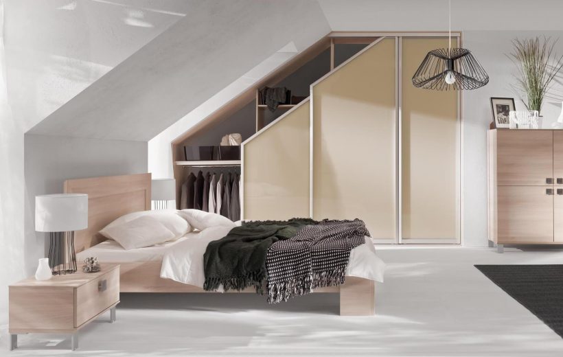 Do problematycznych w urządzeniu wnętrz należy także poddasze. Przestrzeń pod skosami jest trudna do zagospodarowania i wymaga specjalnych rozwiązań. Szafa na wymiar w systemie Heliodor od marki Komandor, wbudowana pod spadem, doskonale wykorzystuje niełatwą aranżacyjnie przestrzeń. To jednak nie jedyne funkcjonalne rozwiązanie. Spadki można wykorzystać także na urządzenie domowego biura, kiedy zintegrujemy pojemną szafę na wymiar z eleganckim biurkiem, które posłuży do pracy. Szkło oraz delikatne dekory płyty w drzwiach szafy sprawiają, że sypialnia (z łóżkiem i szafkami z linii Modern) w pełni zachowuje swój wypoczynkowy charakter. Jest przestronna, nowoczesna i przytulna, a jednocześnie jasna i funkcjonalna.