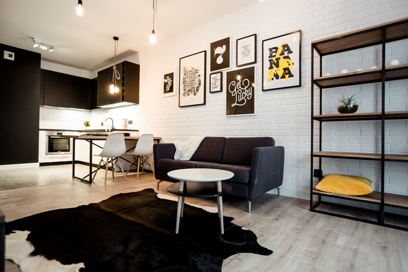 W pokazowym soft lofcie dominuje biel, czerń i różne odcienie szarości. Przełamują ją żółte elementy i ozdobne detale. Ciekawy jest układ mieszkania, z salonem otwartym na kuchnię i sypialnię wydzieloną jako swoisty półwysep.