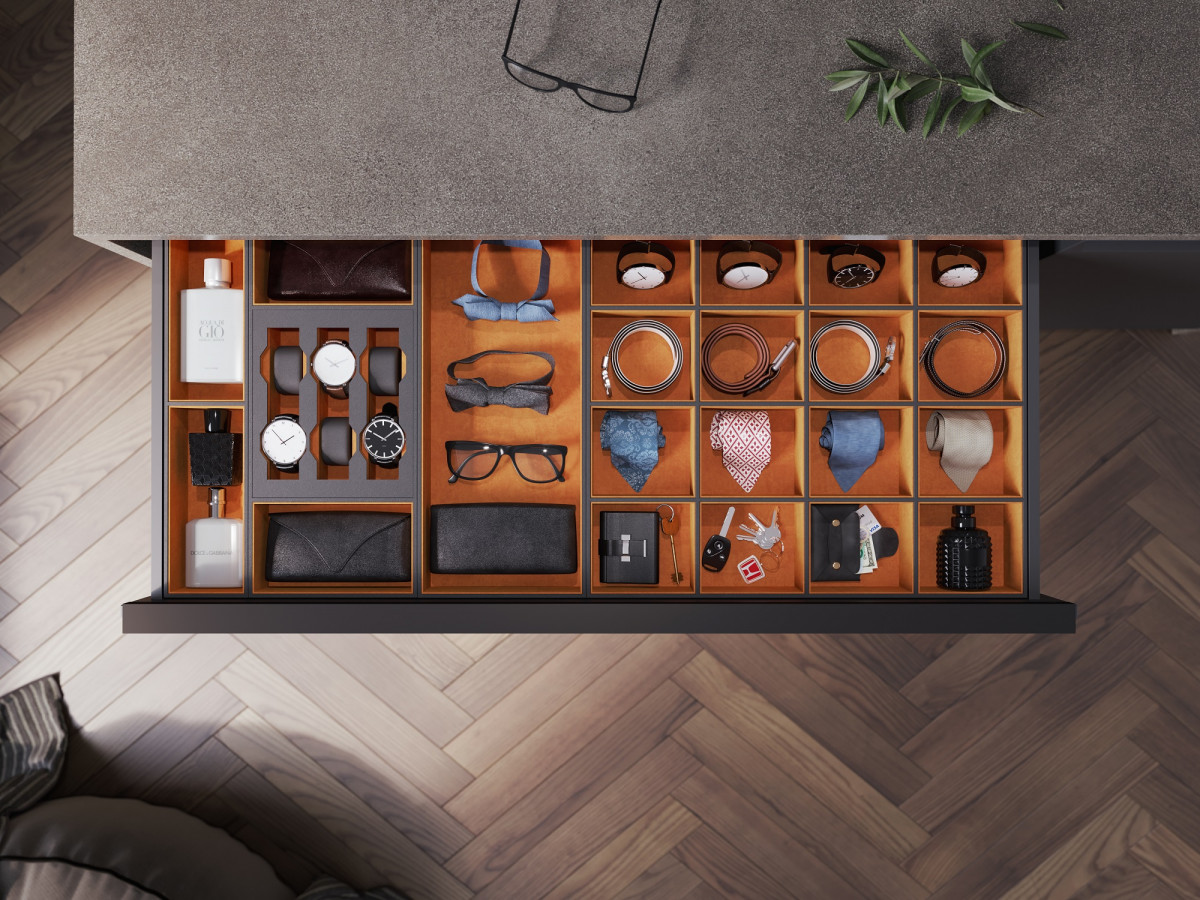 Uporządkowanie produktów, które przechowujemy w szufladach Slim Box jest o wiele łatwiejsze, gdy skorzystamy z gotowych systemów organizacji. Sprawdzą się zwłaszcza specjalne wkłady, które zaprojektowane zostały z myślą o garderobie, a także o zróżnicowanych potrzebach kobiet i mężczyzn.