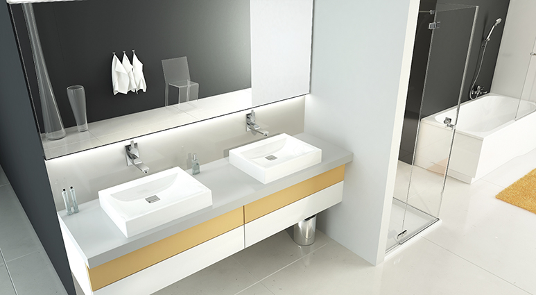 Jeżeli tylko przestrzeń pozwala na zastosowanie dwóch umywalek, pomysł ten może okazać się strzałem w dziesiątkę! Dzięki takiemu rozwiązaniu stworzymy dwie oddzielne przestrzenie w łazience – dla niej i dla niego. Możemy pokusić się o zastosowanie dwóch umywalek nablatowych zamontowanym na jednym długim blacie. Dwie umywalki z przestrzenią w postaci blatu to zdecydowanie funkcjonalne rozwiązanie, które stwarza dodatkowe miejsce do przechowywania najczęściej używanych kosmetyków i takich przedmiotów jak np. golarki czy szczoteczki do zębów. W ofercie Sanplast proponujemy dwa wzory:
