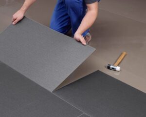 Przy montażu elastycznej podłogi winylowej pierwszym etapem jest oczyszczenie i wyrównanie podłoża oraz aklimatyzacja materiałów. Temperatura powietrza w pomieszczeniu powinna wynosić od 18°C do 26°C, temperatura podłogi – 15°C do 25°C, a wilgotność względna powietrza w przedziale 55-65 %. Odpowiednie warunki powinny być utrzymane przez co najmniej 72 godziny przed, w trakcie i po klejeniu wykładziny. Po równomiernym nałożeniu kleju na przygotowane wcześniej podłoże, poszczególne elementy należy układać szczelnie i bez naprężeń, a następnie dociskać na całej powierzchni za pomocą wałka lub płytki dociskowej. W kolejnym etapie trzeba równomiernie i powoli rozwalcować wykładzinę za pomocą walca segmentowego. W obszarze krawędzi zaleca się użycie ręcznej rolki dociskowej.