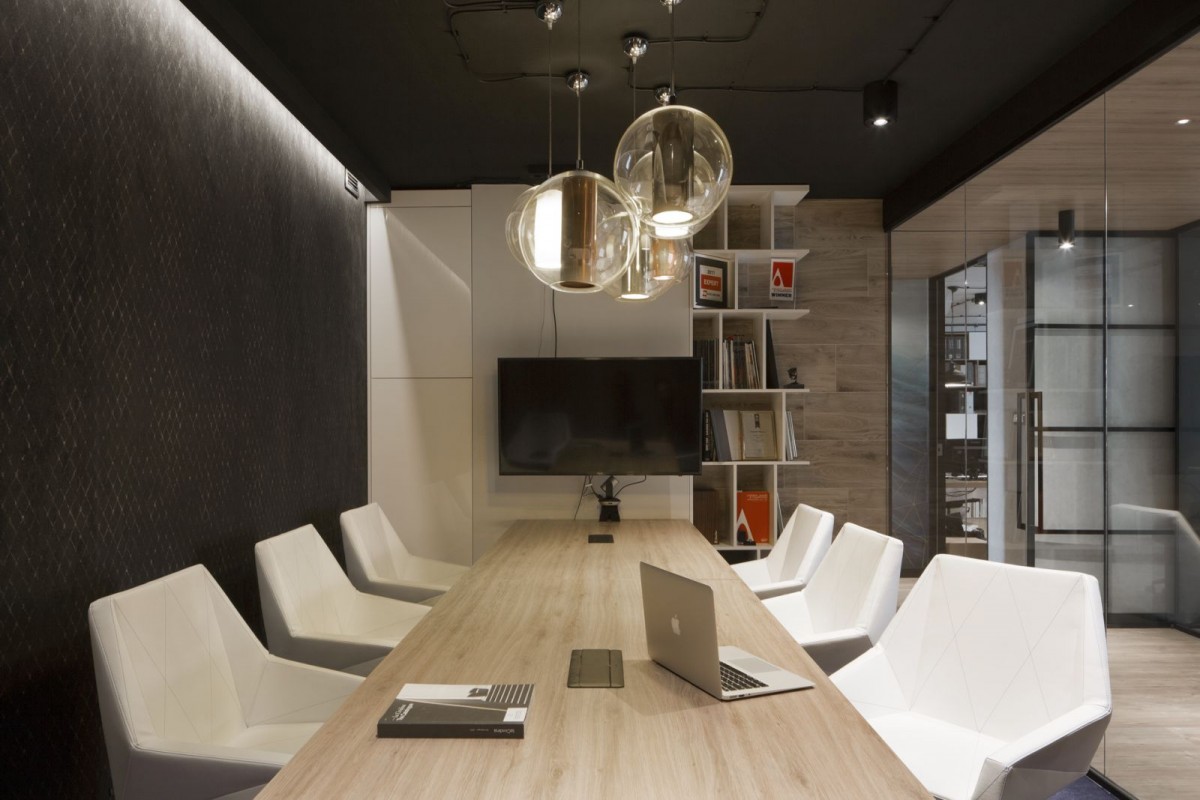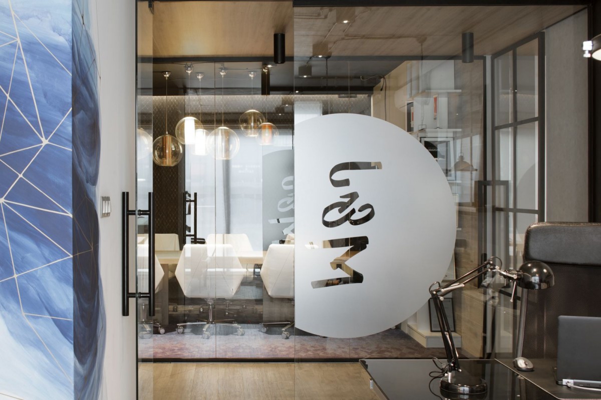 Dużo jest tu także szkła – sale konferencyjne i miejsca spotkań podzielono ścianami wykonanymi z jego dużych tafli. Szklane są także drzwi prowadzące do pomieszczeń, w których pracują poszczególne zespoły firmy. Projektanci zaaranżowali także miejsca do pracy wspólnej – oddzielone od pozostałej części pomieszczenia specjalnymi dividerami w postaci biblioteczek, wypełnionych książkami z fachową literaturą lub szklanych naczyń z zielenią.