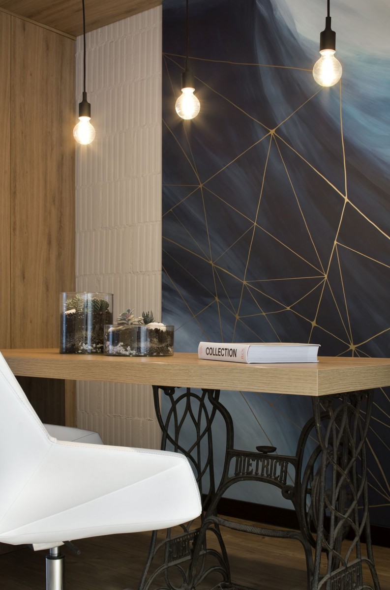 Architekci, których pasją i jednocześnie pracą jest projektowanie wnętrz, także i tym razem podeszli niezwykle kreatywnie do zaaranżowania przestrzeni. Fakt ten nikogo nie dziwi, bo design wpisany jest przecież w ich życie niemal od zawsze. Motywem przewodnim wnętrz nowego biura, który pojawia się w różnych pomieszczeniach, jest niebieski mural ze złotymi, geometrycznie przecinającymi się liniami. Nie dominuje on nad całością, a jedynie akcentuje swą obecność i spaja cały projekt w jedną kompozycję.