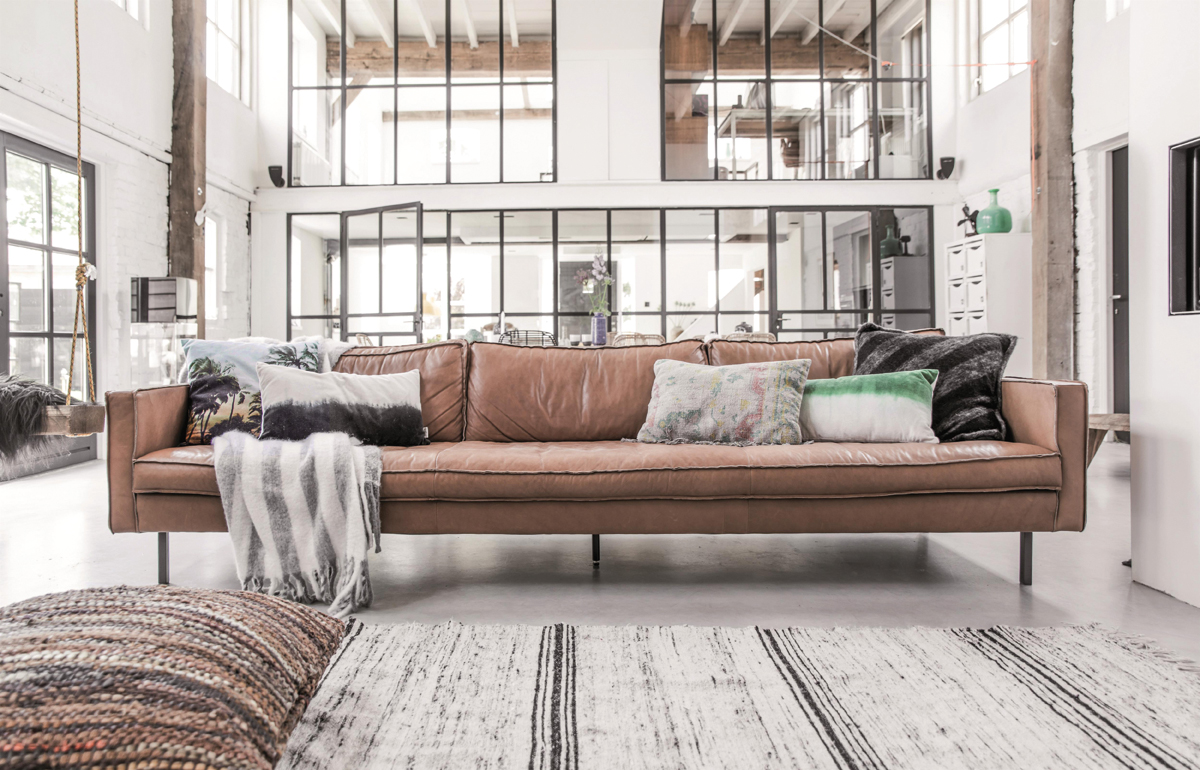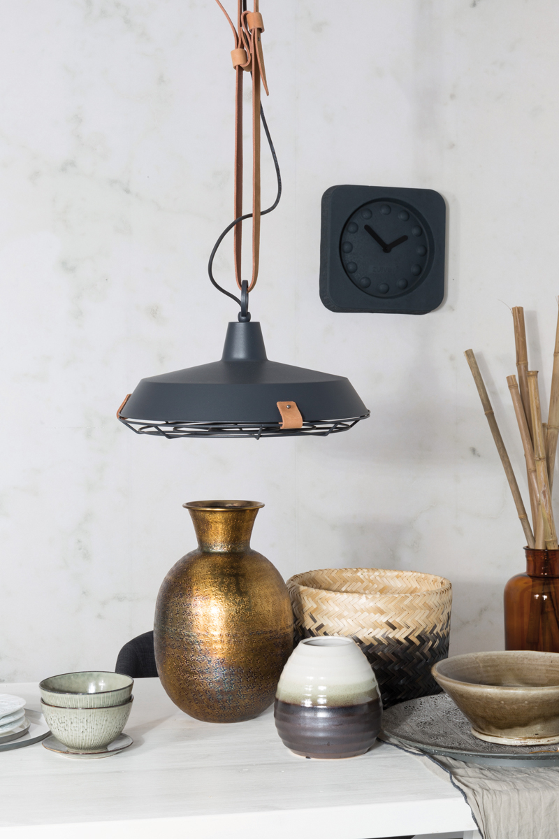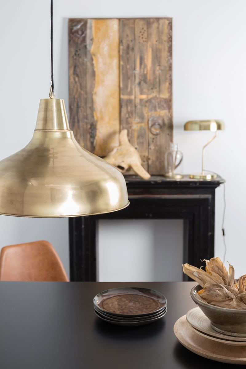 Złociście połyskują nogi krzeseł, blaty stolików i oprawy lamp, co kontrastuje z ich minimalistycznymi, niewyszukanymi kształtami. Do łask wróciła skóra, ale nie ta perfekcyjnie wygarbowana, tylko wyglądająca na mocno zużytą. Zewnętrzne szwy dodatkowo podkreślają jej daleki od salonowego szyku charakter.
