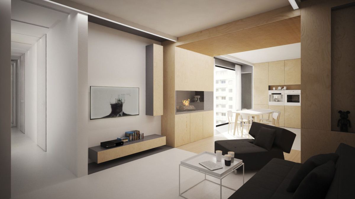 Pierwszy lokal stanowiło małe ekonomiczne mieszkanie, które składało się z salonu, kuchni i łazienki. Drugi, już większy, posiadał więcej pomieszczeń, co dało podstawy do nadania nowych funkcji dotychczasowym przestrzeniom. Mieszkania połączono poprzez wyburzenie ściany, tworząc tym samym korytarz. Można się z niego dostać do dwóch sypialni dziecięcych i sypialni głównej. Wejście do mniejszej nieruchomości zostało zabudowane. Większe mieszkanie było głębokie i mało doświetlone, przez co kuchnia miała nikły dostęp do światła. Główną zmianą funkcjonalną było przeniesienie jej do pomieszczenia z oknem, a salon został umiejscowiony bliżej wejścia. „Kuchnia z jadalnią została przedzielona drewnianym kubikiem, w który wbudowany został biokominek. Z góry sprawia wrażenie włożonego we wnętrze mieszkania. Na suficie pojawiły się drewniane żyletki, między którymi znalazło się oświetlenie. Włączone wieczorem nadają wnętrzu klimat. Przy kominku można usiąść i na wygodnym fotelu relaksować się, np. czytając książki czy popijając ulubiony napój. Jego głównym zadaniem jest oddzielenie strefy dziennej od kuchni, której kolorystyka i układ stanowią integralną część całego mieszkania” – opowiada Anna Paszkowska-Grudziąż architekt z pracowni 81.WAW.PL.