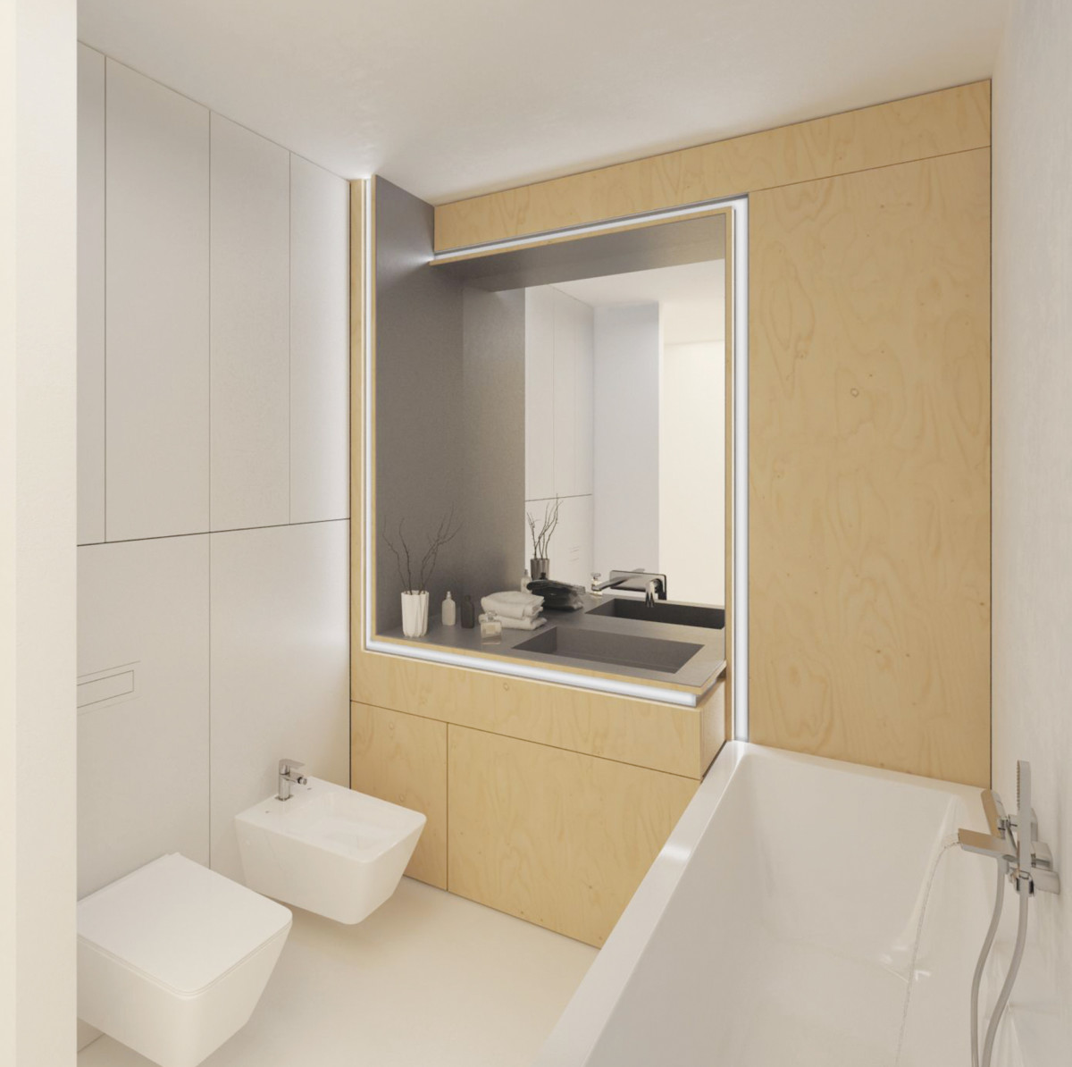 Na uwagę zasługuje również łazienka gościnna z wanną, która jest cała biała. Jej głównym elementem jest podkreślona umywalka, której bryła jest spójna z całym mieszkaniem. Została otoczona drewnem, a wnęki wypełnia szarość.